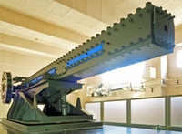 レールガンとは、電気エネルギーを利用して弾丸を発射する次世代砲です。火薬を用いる従来砲に対して、レールガンは電流と磁場によるローレンツ力を利用して弾丸を発射する原理のため、従来の戦車砲の弾丸初速1,750m/sに比べて、2,500m/s以上の速度が実現可能です。この結果、弾丸威力の向上・最大射程の延長・目標到達時間の短縮による命中率の向上が期待される将来装備品と位置づけられます。